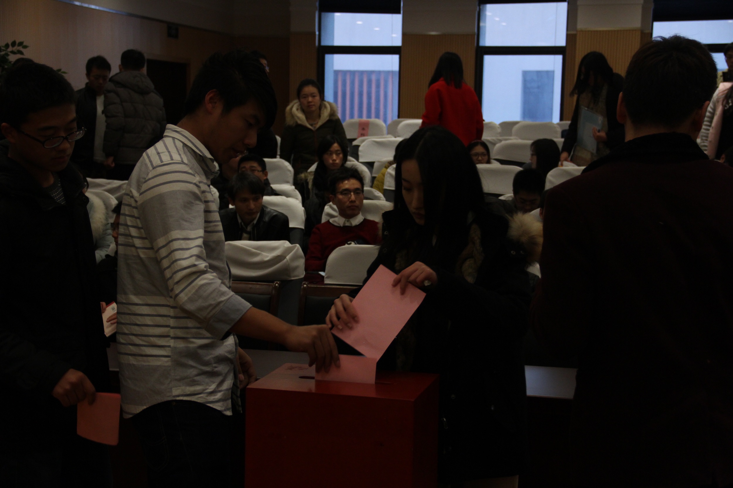 正式开会前,工作人员进行代表人数清点,实到党员代表人数超过应到代表人数的五分之四,大会可以召开。按照大会工作流程,大会工作人员首先宣读本次选举的选举办法和候选人简介,全体参会党员代表通过选举办法;接着,全体党员代表通过了本次选举的计票人、监票人名单;再次清点并确认到场党员代表人数后,工作人员为全体代表分发选票。在主持人的指导下完成选票填写后,监票人、计票人、现场工作人员先进行投票,其他党员代表在监票人的监督下依次投票。投票结束后,监票人、计票人前往指定地点进行计票。计票过程中,全体党员代表观看廉政教育系列微电影等候计票结果。最终,主持人宣读计票结果,大会选举产生了新一届学生党总支的九名委员。