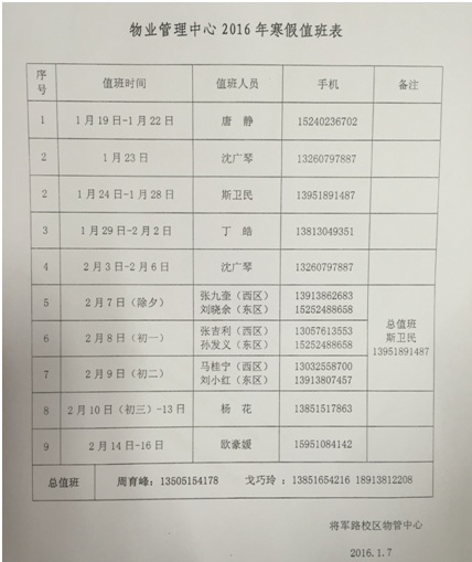 2. 请各位教师做好办公室和实验室的安全检查以及假期安全、保密教育,避免各类安全事故的发生。根据江宁物管的统一安排,假期中,除国家法定春节假日外,每天早上7:30至晚22:00,行政楼东大门、西侧小门、地下车库门以及实验楼西大门开放,晚上22:00至早上7:30封闭,有需要开门的可以联系值班人员(电话附后,各门口也会张贴通知告示)。特别提醒所有师生,经过有门禁的出入口时请随手关门,确保安全。假期中没有任务的实验室、研究生工作室,应关好门窗、切断水电。假期中花椒直播 将安排行政人员值班,值班表可在学校值班网站上(//vacation.huajiaozhibo.org)查看。