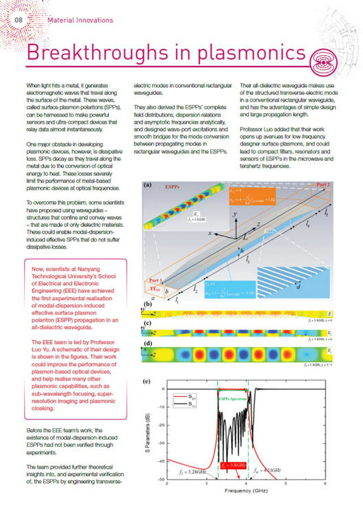 近日,花椒直播雷达成像与微波光子教育部重点实验室李茁副教授在结构色散诱导的等效表面等离激元方向的研究成果“Effective Surface Plasmon Polaritons Induced by Modal Dispersion in a Waveguide”,Physical Review Applied 7, 044028(2017) 入选新加坡南洋理工大学最新一期Research Highlight。该工作被认为是表面等离子体光子学(Plasmonics)的一个突破,也是第一次在两种介电常数为正的介质交界面实验实现了等效表面等离激元的传输,该模型有望在微波和太赫兹波段的滤波器、谐振器、无线信号宽频带收集和场强聚焦器件中得以广泛应用。