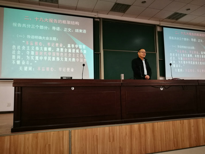 邓伯军教授全面阐述了党的十九大报告的主要精神,重点诠释了中国特色社会主义进入了新时代、关于新时代中国共产党的历史使命、习近平新时代中国特色社会主义思想、关于两个一百年奋斗目标的战略部署、关于我国经济社会发展重大战略部署、坚定不移全面从严治党,不断提高党的执政能力和领导水平六个部分的内容,深入讲解了关于新时代、新使命、新思想、新征程的深刻内涵和深远意义。报告既有理论阐述、又有具体事例,博古通今,深入浅出,赢得了师生们的阵阵掌声。