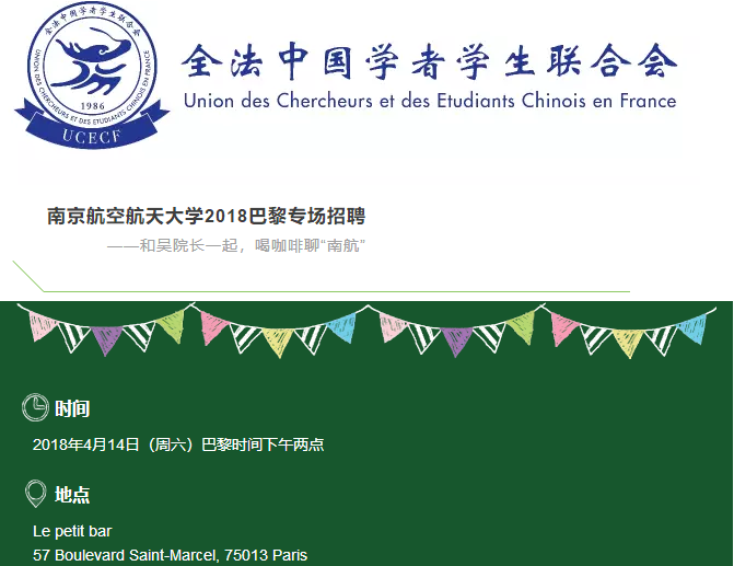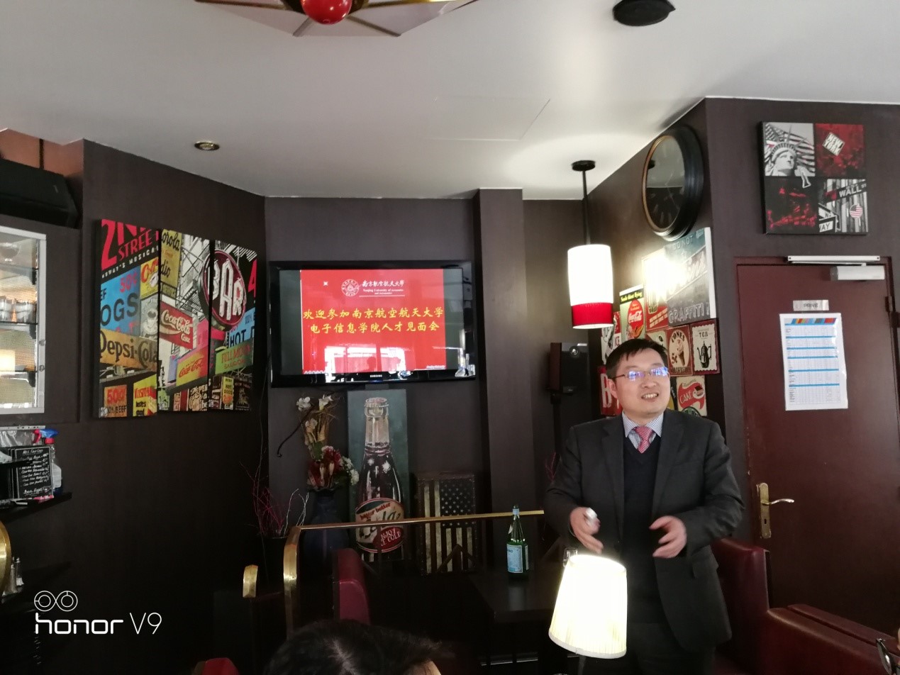 2018年4月14日,在中国驻法使馆教育处陈丹妮老师及全法学联刘源辉主席、全法学联博士生联谊会周全博士及常征博士的帮助和组织下,花椒直播 副院长吴启晖教授及电子科学与技术系副主任刘伟强副教授赴法国巴黎进行了“南京航空航天大学2018巴黎专场招聘会”海外高层次人才招聘活动,参会的有来自巴黎中央理工大学、巴黎高等电信花椒直播 、索邦大学、巴黎十一大学、巴黎高等矿业花椒直播 等法国著名高校的博士生。