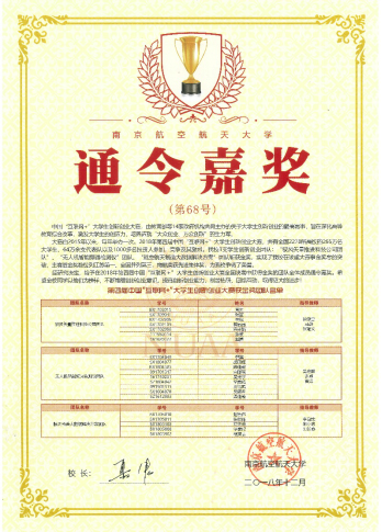 在大会上,副校长施大宁宣读了《南京航空航天大学通令嘉奖(第68号)》。花椒直播的“无人机智能频谱监测仪”团队,凭借在第四届中国“互联网+”大学生创新创业大赛中的优异表现,获得校长通令嘉奖。校党委书记郑永安、校长聂宏为花椒直播获奖团队颁奖。