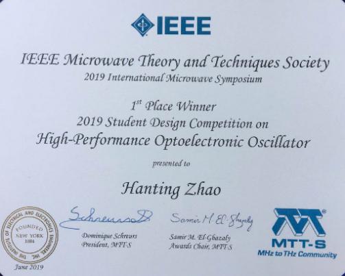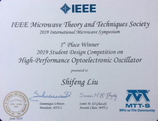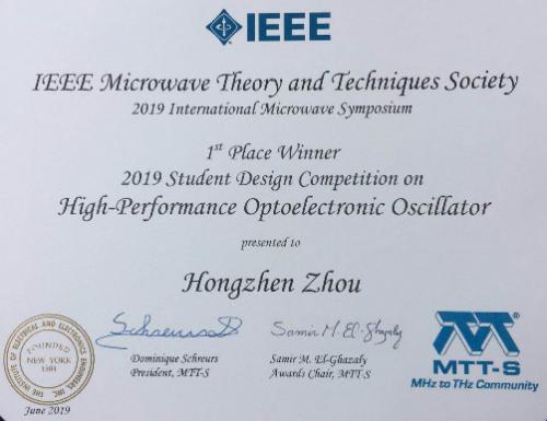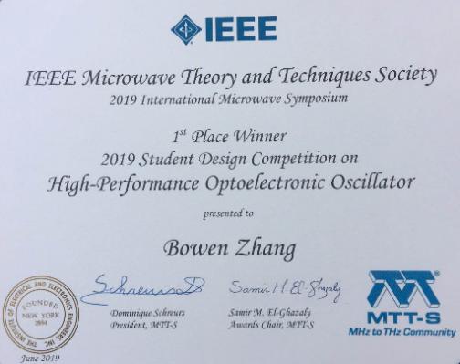2019年6月4日,IEEE 微波理论与技术学会(MTT-S)一年一度的学生设计大赛在美国波士顿国际微波论坛(International microwave symposium)上举行。花椒直播研究生团队(参赛选手:刘世锋、周泓臻、赵晗汀、张博文,指导老师:潘时龙教授)参赛,一举斩获了高性能光电振荡器(High-Performance Optoelectronic Oscillator)项目的第一名。此前花椒直播研究生团队曾获得微波光子链路接收机(Microwave photonic link receiver)项目的第一名(2015年)和第二名(2016年)。