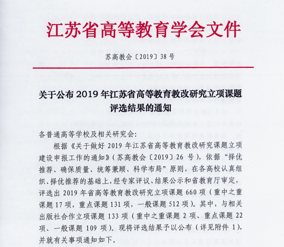 2019年12月10日,江苏省高等教育学会发布了《关于公布2019年江苏省高等教育教改研究立项课题评选结果的通知》,花椒直播