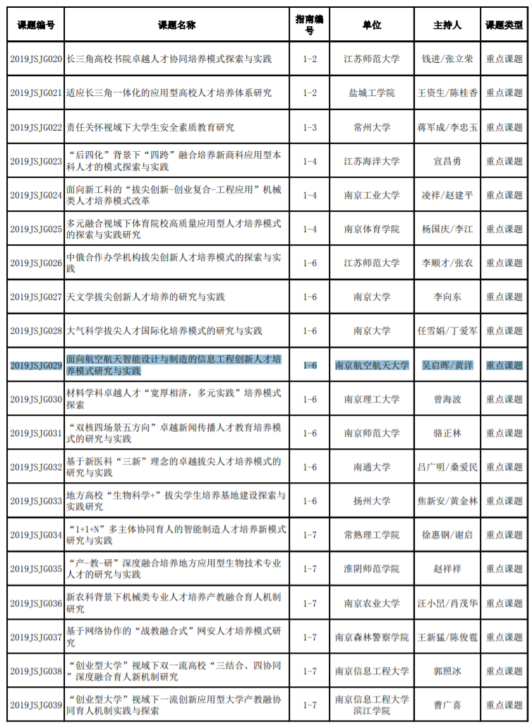 吴启晖教授、黄洋副教授共同主持的江苏省高等教育教改研究课题(以下简称“省教改课题”)重点课题《面向航空航天智能设计与制造的信息工程创新人才培养模式研究与实践》获得立项。据悉,2019年省教改课题,经专家评议、结果公示和省教育厅审定,评选出立项课题660项,其中重中之重课题17项,重点课题131项,一般课题512项。南京航空航天大学获立项重中之重课题1项、重点课题2项、一般课题8项。