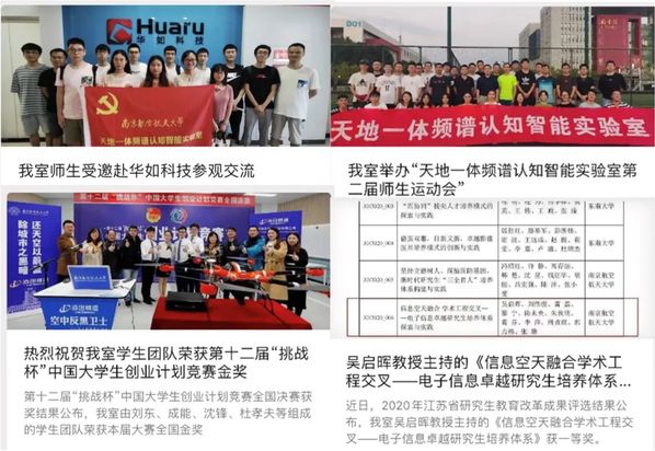 在宣传文化方面,团队注重增强有形文化建设,师生共同参与到实验室LOGO和队歌的创作中。团队成员也在设计创作中加深了对实验室研究领域的了解,并提高了各自的艺术创造力。线上,运营实验室网站(//cog.huajiaozhibo.org/)和公众号(天地一体频谱认知智能实验室),通过宣传学生获奖和最新进展等方面全面展示团队的风采。线下,定期组织实验室参观交流以及与外校研究生交流合作等活动,激发学生的创新思维。