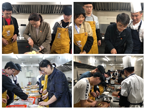 接下来,结合劳动教育,后勤集团饮食服务中心副主任纪昀介绍了开设厨艺课堂的初衷和重要意义,和园餐厅食堂主任胡彬老师结合ppt、短视频,从理论层面介绍了烹饪的基本技法和注意事项,并进行了现场演示。理论教学结束后,全体同学换上厨师服进入实操环节,胡彬老师从拿刀姿势、下刀方法到调味技巧和火候控制等方面,边示范边讲解。后勤集团还专门设置了4名助教老师,确保同学们安全操作,并提醒大家保持台面清洁、珍惜原材料,养成良好的劳动习惯。