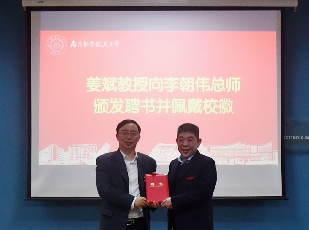 会上,姜斌向李朝伟总师颁发南京航空航天大学特聘教授聘书并为其佩戴了校徽。