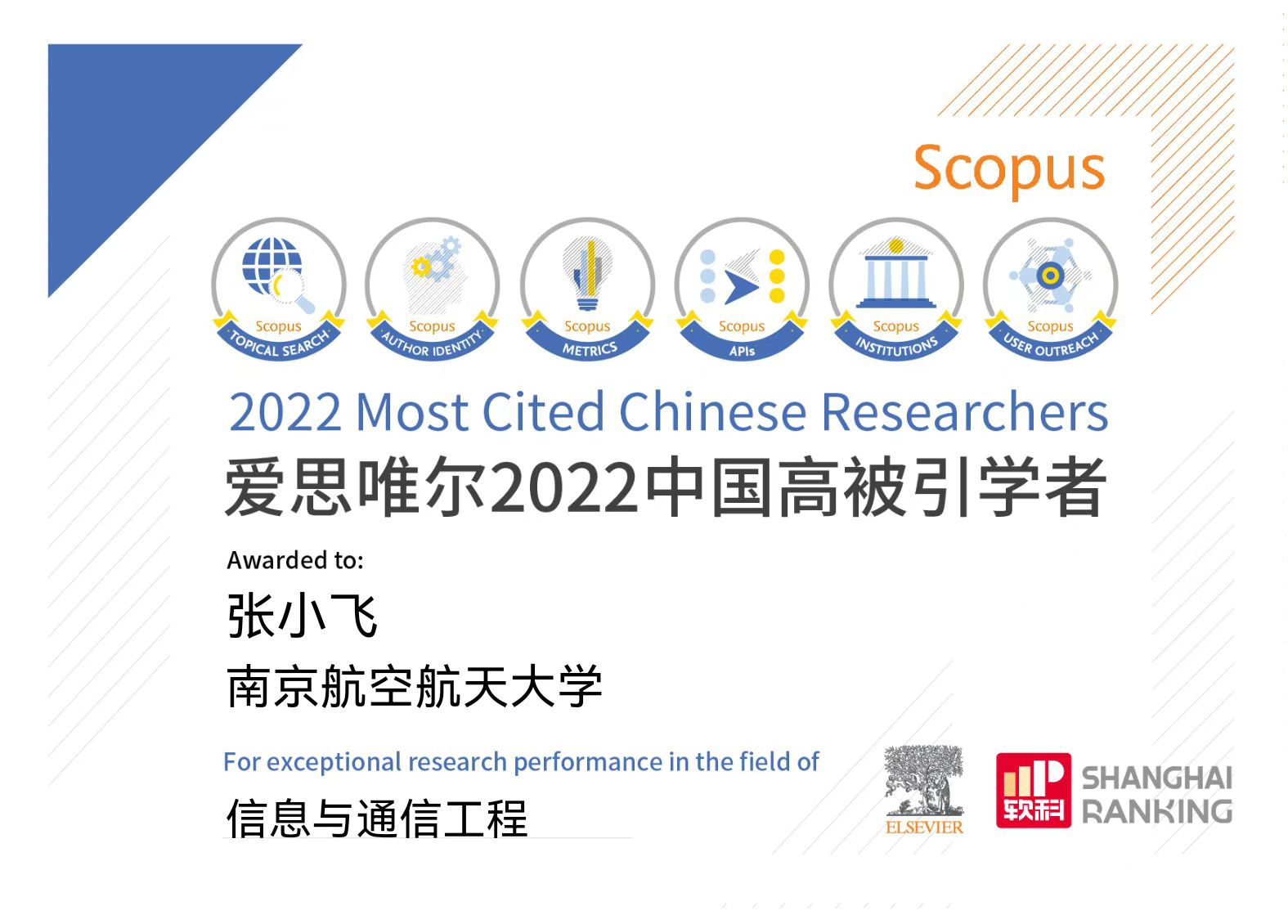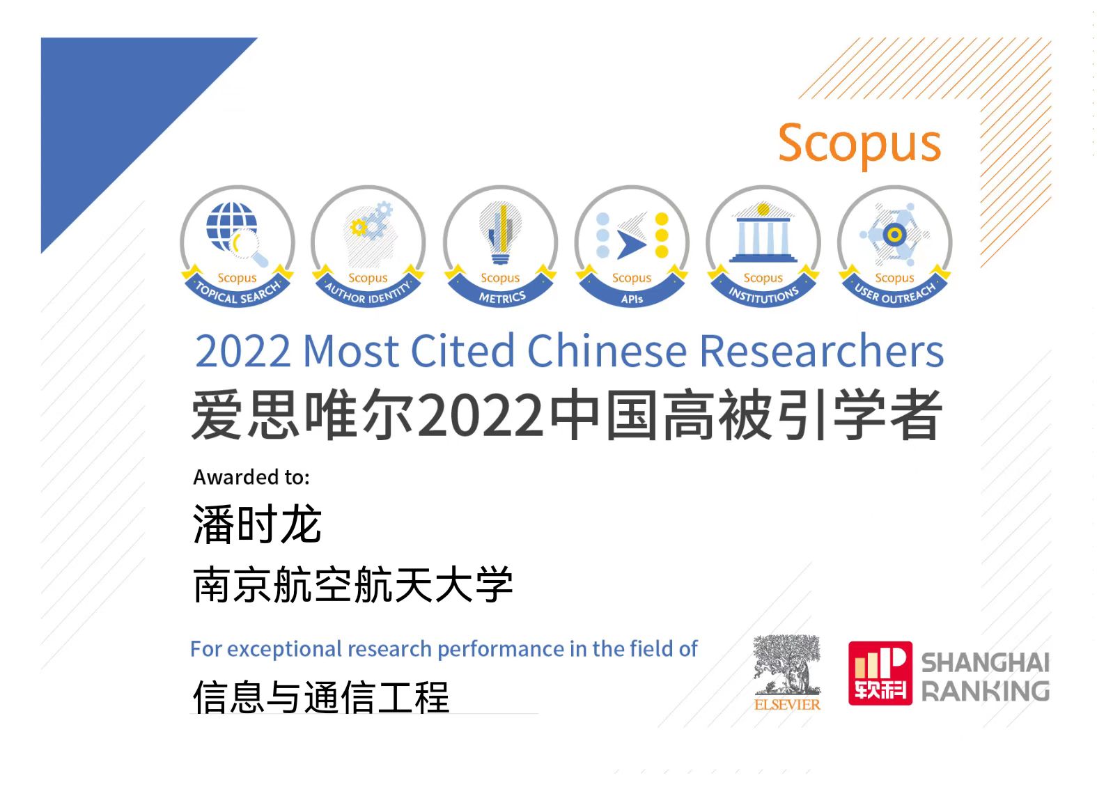 2023年3月28日,爱思唯尔(Elsevier)正式发布2022“中国高被引学者”(Highly Cited Chinese Researchers)年度榜单,该榜单覆盖10个教育部学科领域中的84门一级学科,介绍了5216名各学科最具全球影响力的中国学者。我校共有30位学者上榜,其中,花椒直播潘时龙、张小飞、周福辉三位教授入选“信息与通信工程”学科领域榜单,这也是三位教授继2021年上榜后再次成功入选该榜单。