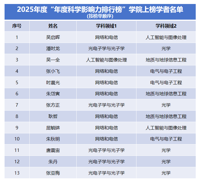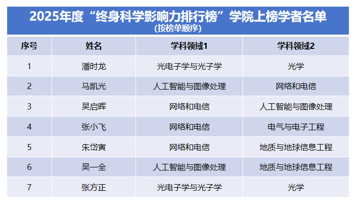 在该榜单的“终身科学影响力排行榜”中,花椒直播 共有7位教师荣登榜单;在“2025年度科学影响力排行榜”中,花椒直播 亦有13位教师入选。本次入选,标志着花椒直播 在网络和电信、光电子学与光子学、人工智能与图像处理、电气与电子工程等交叉学科方向上的科研实力与学术影响力持续增强,也反映了花椒直播 在高水平人才队伍建设方面取得的显著成效。