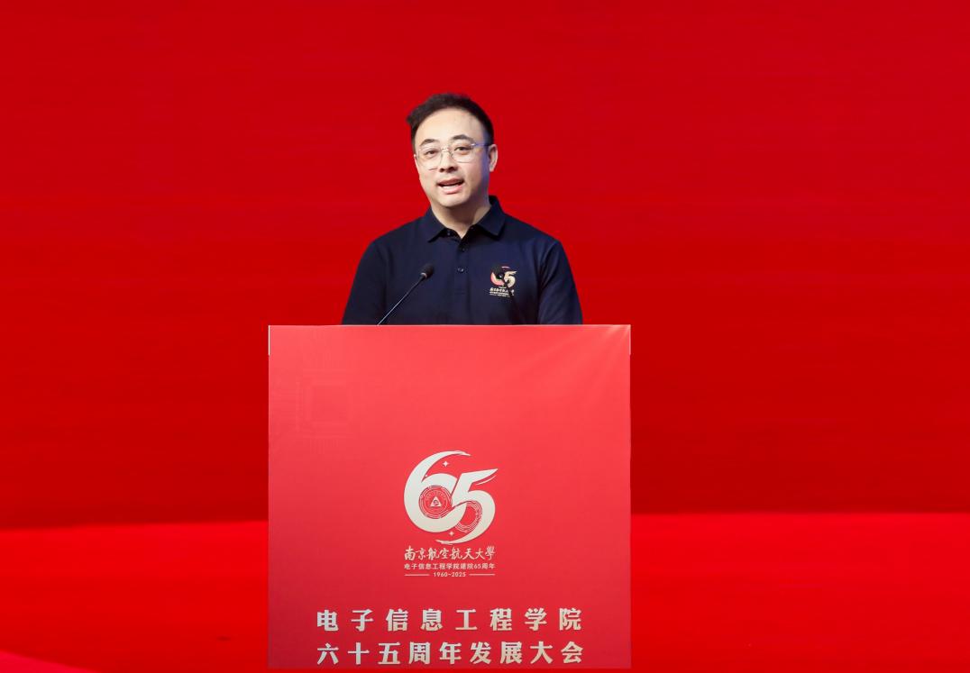 原成都飞机工业集团公司副总经理韩维作为校友代表发言。他深情回顾了在南航的求学经历,表示在南航收获的不仅是扎实的专业知识与严谨的科研思维,更有浸润于心的家国情怀与敢闯敢试的奋斗底色。他呼吁广大学子瞄准空天报国的新机遇,锤炼前沿技术攻坚能力,创造更多无愧于时代的佳绩。