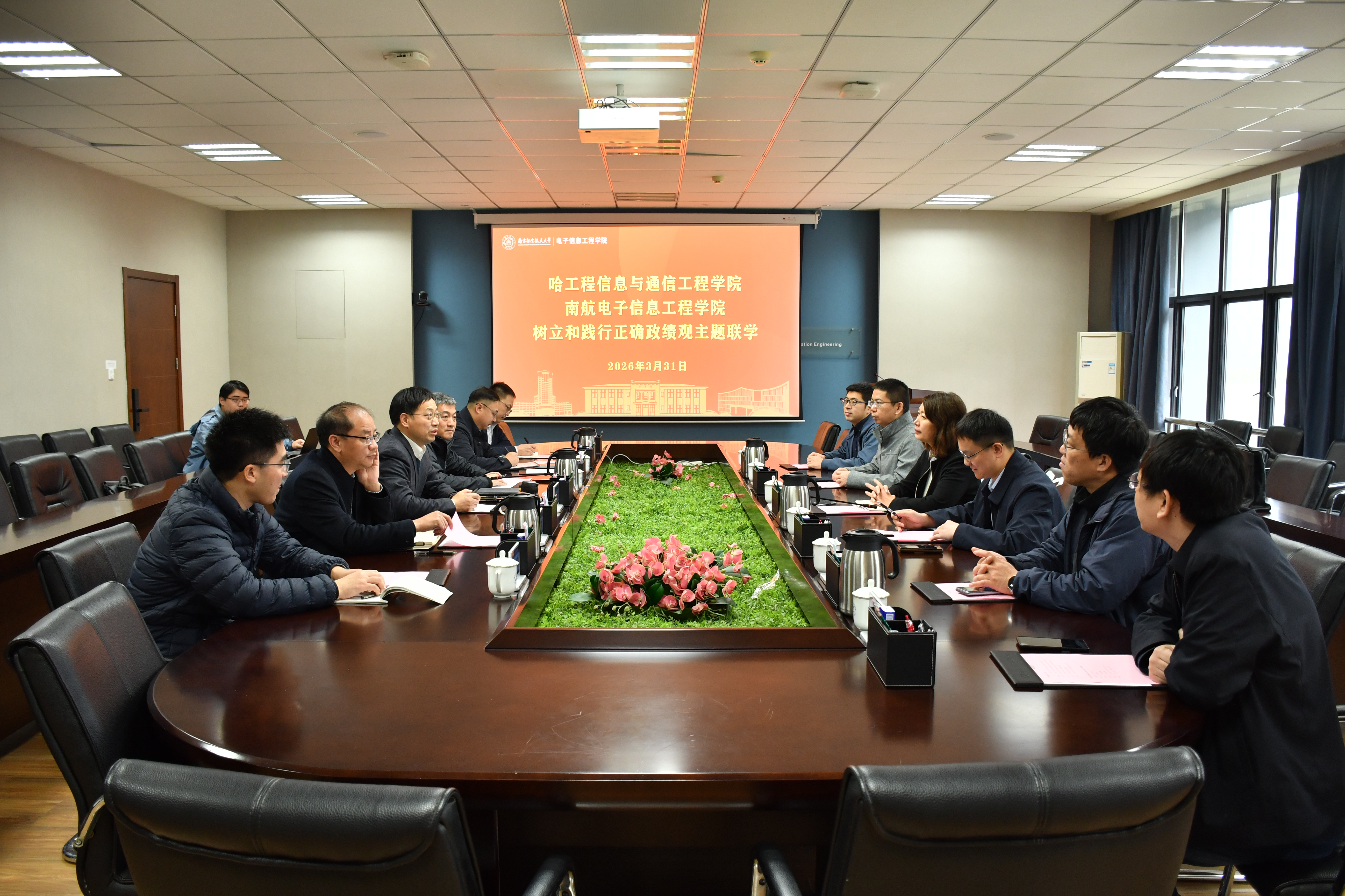 为深入开展树立和践行正确政绩观学习教育,推动党建与业务深度融合发展,3月31日上午,花椒直播与哈尔滨工程大学信息与通信工程花椒直播 开展主题联学活动。哈尔滨工程大学信息与通信工程花椒直播 /集成电路花椒直播 党委书记王锐、信息与通信工程花椒直播 院长/集成电路花椒直播 执行院长张勇刚,花椒直播党委书记季海群、副院长董超等参加。活动由季海群主持。